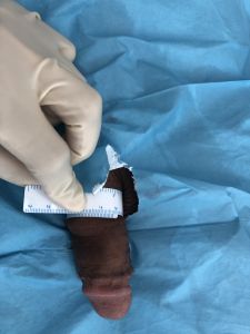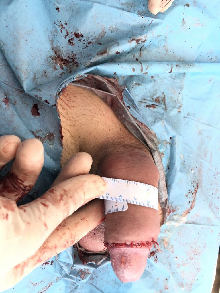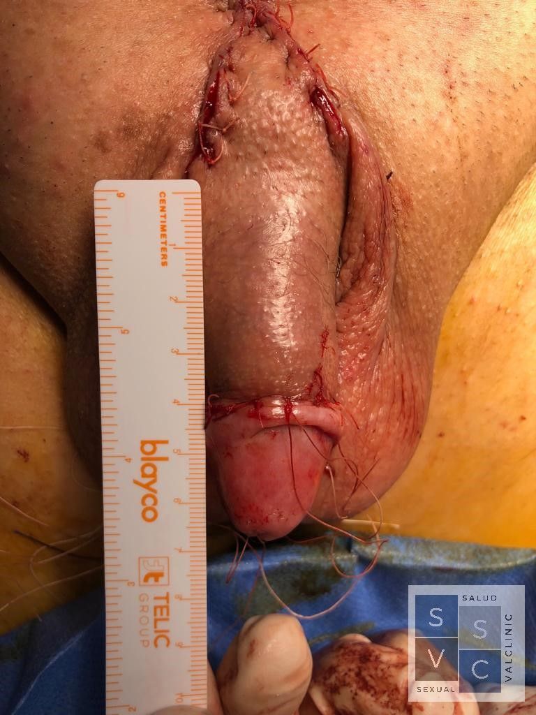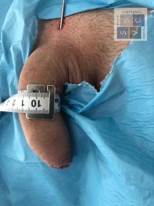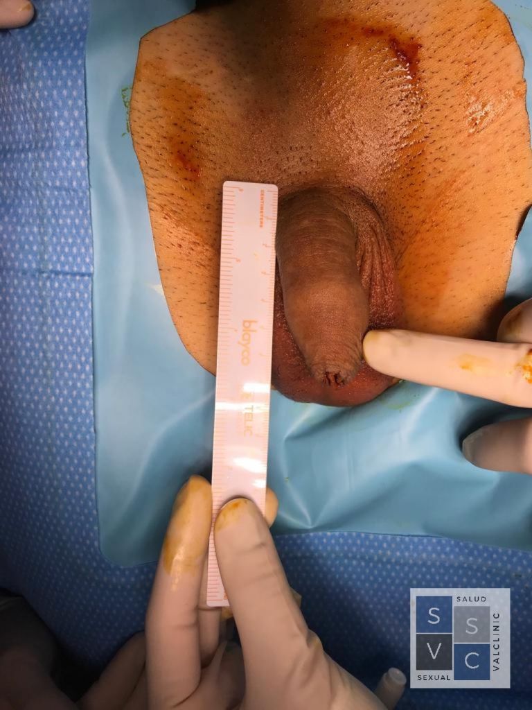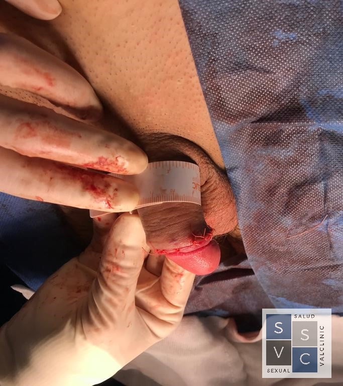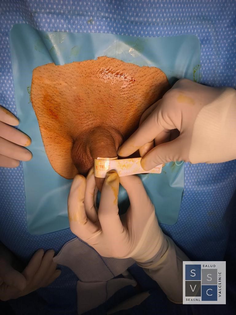 In the same procedure, a V-Y closure of the surgical wound is performed on the skin that allows tubularization of the section of skin gained in the penis enlargement to achieve a more natural effect and reduce the risk of subsequent retraction. In cases where the skin is sufficiently elastic and a better aesthetic result is desired in the pubic scar, the incision instead of inverted V with posterior closure with VY advancement plasty can be performed through a small transverse incision at the base pubis, leaving a minimal posterior aesthetic scar.
